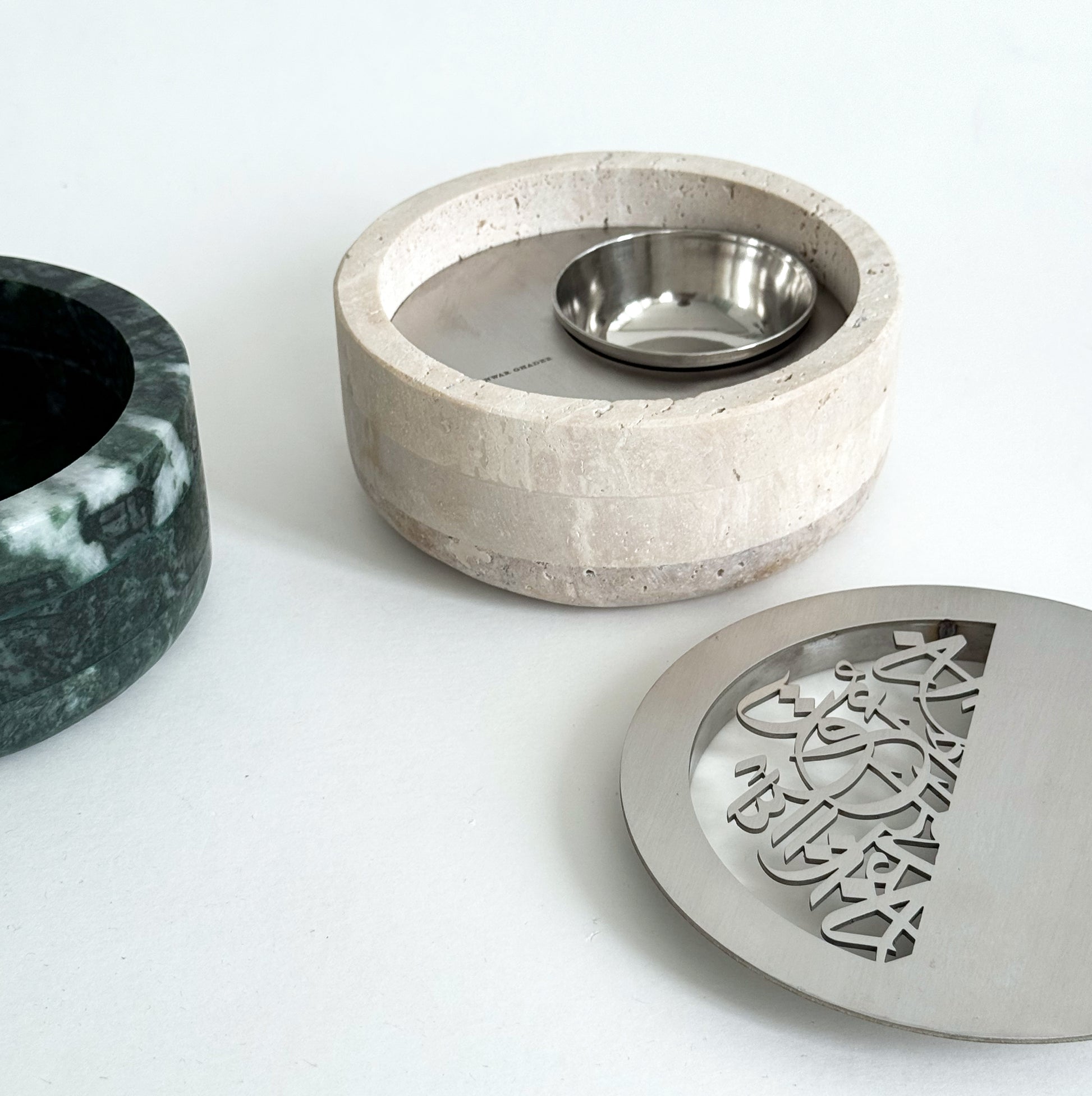 مصنوعة من رخام الزمرد الفاخر مع غطاء علوي من الستانلس ستيل ونقوش خطية متقنة، تمزج هذه المبخرة الفاخرة بين التراث والفن الحديث لتضفي لمسة راقية على تجربة البخور الخاصة بك