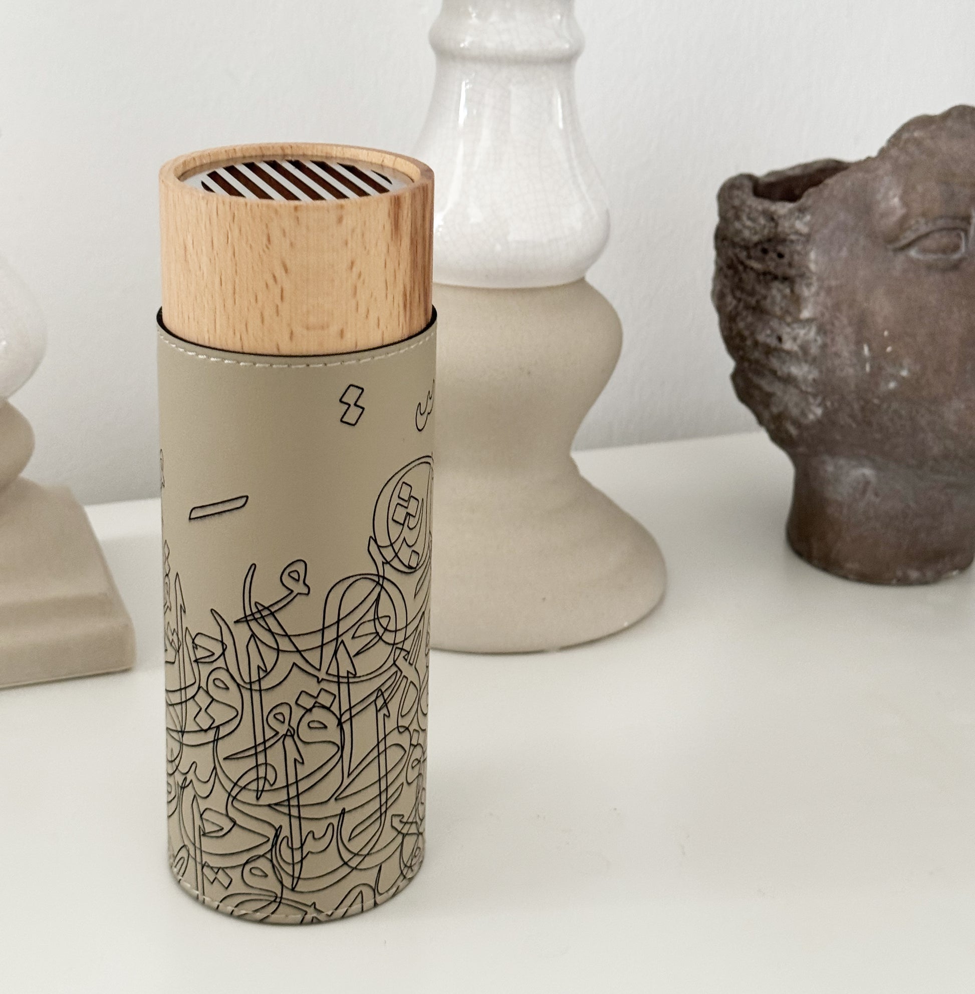 A sleek mubkhar crafted from natural wood and premium leather, finished with subtle Arabic calligraphy. A modern design that blends tradition and elegance—perfect for everyday bukhoor or as a refined décor piece.