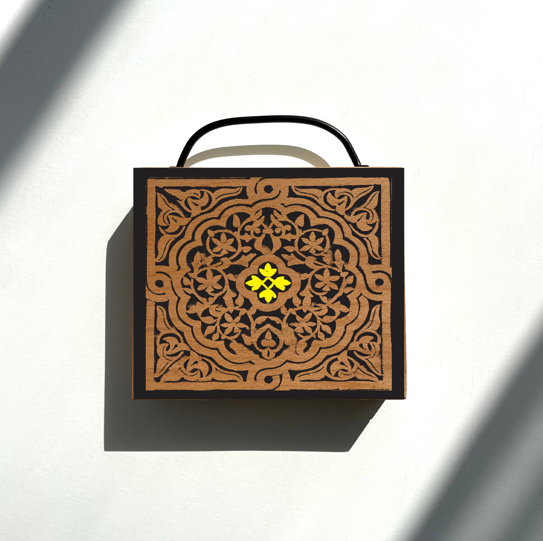 This Clutch was inspired by a vintage Suitcases, the handle is Black Iron with an Iron Hook clap to close the clutch. The clutch is made out of Wood with velvet inner to give its smoothness along with a print of our design on the front and back of the clutch. Making the clutch a Vintage statement to be carried around with any day or night outfit.